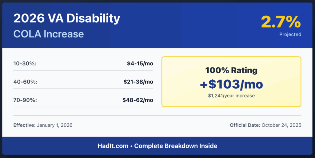 2026 VA disability COLA projected at 2.7%. See exact payment increases for 10%-100% ratings under all four scenarios. Official announcement Oct 24.