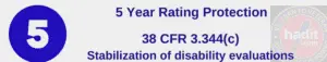 5 year VA rating protection states that the VA can’t reduce a veteran’s disability that’s been in place for 5 years unless the condition improved