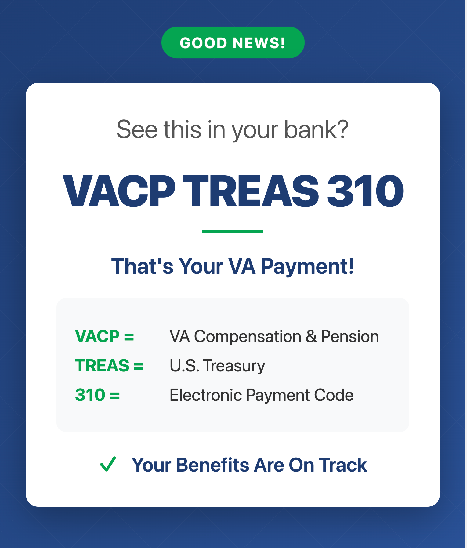 VACP TREAS 310 = VA disability comp or pension. VAED TREAS 310 = GI Bill. IRS 310 = IRS. One‑time larger amounts often = back pay.”
